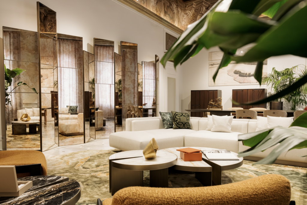 Among the key pieces, the MASCAGNI sofa stands out as a bold presence, defined by its signature plissé upholstery and generous proportions. The MANZONI sofa, modular in nature, offers a wide range o configurations, combining upholstered volumes, leather, and metal elements with a strong emphasis on Italian craftsmanship. The ROYAL BYBLOS sofa expresses the grandeur of living through large, balanced volumes and a striking presence, reinterpreting the iconic BYBLOS sofa from the first collection, one of the brand’s best-selling pieces.