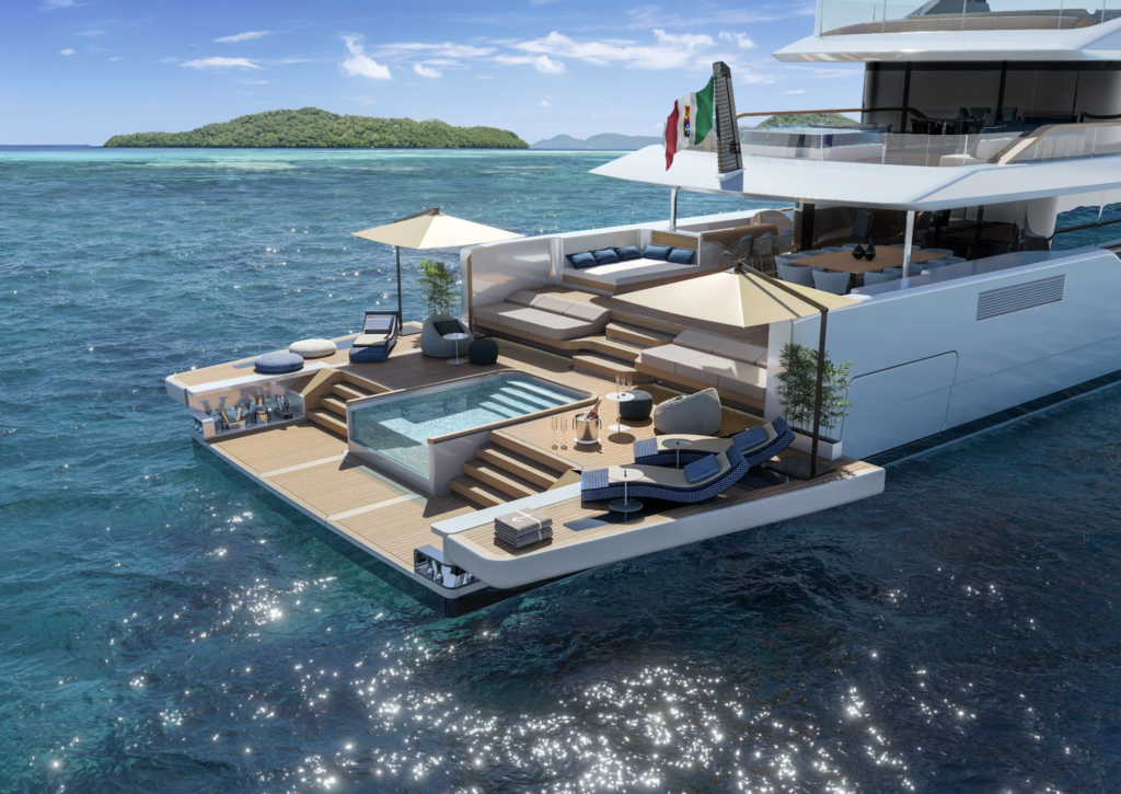 An alternative configuration features the upper deck dedicated exclusively to the owner, with an aft suite, direct access to the external cockpit and a private jacuzzi, further strengthening the concept of privacy and spatial separation.